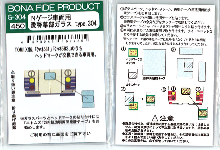 | G-304 | 愛称幕部ガラス type4 (TOMIX クハ581.583用) | 6枚 | ¥495 | ¥495 | 再生産 |