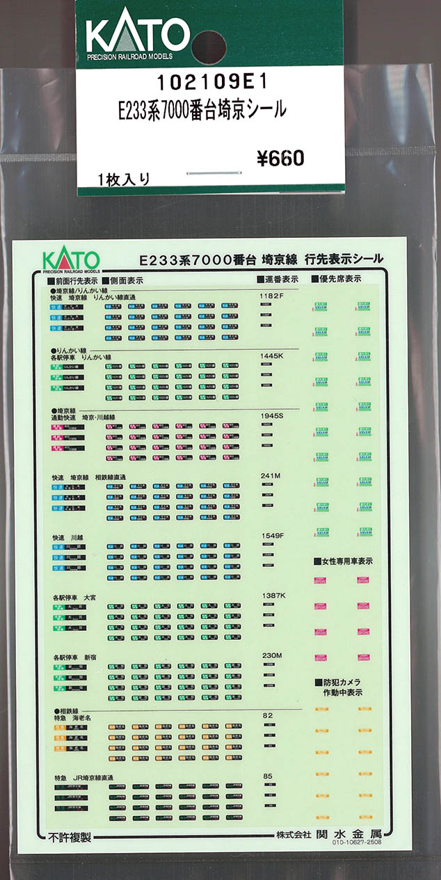 | 102109E1 | E233系7000番台埼京線 シール | 1枚入 | ¥660 | ¥660 | 新製品 |