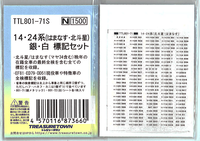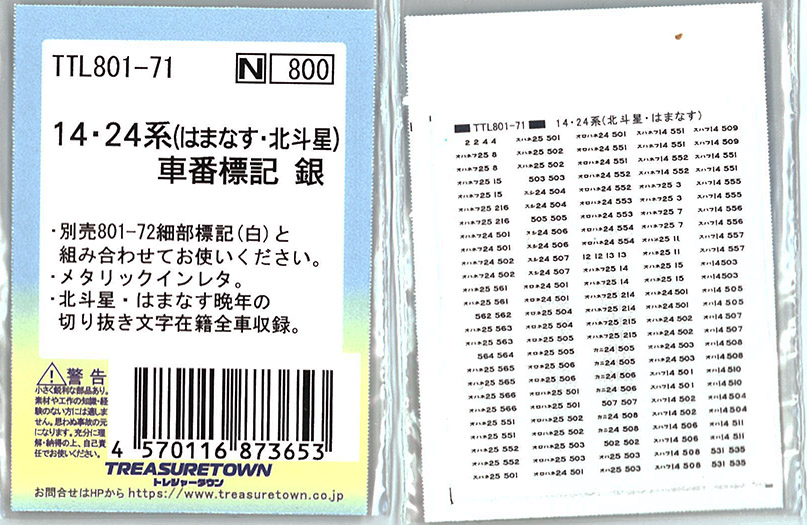 | TTL801-71S. | 14系・24系(はまなす・北斗星)銀・白 標記セット | 1枚入 | ¥1,650 | ¥1,650 | |