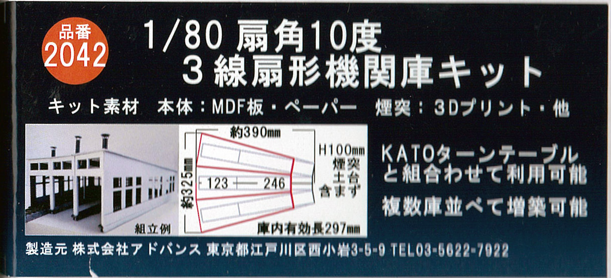 | #2042 | 扇角10度 3線扇形機関庫キット(ペーパーキット) | \10,450 | \9,405 | 新製品 | 入荷済 |