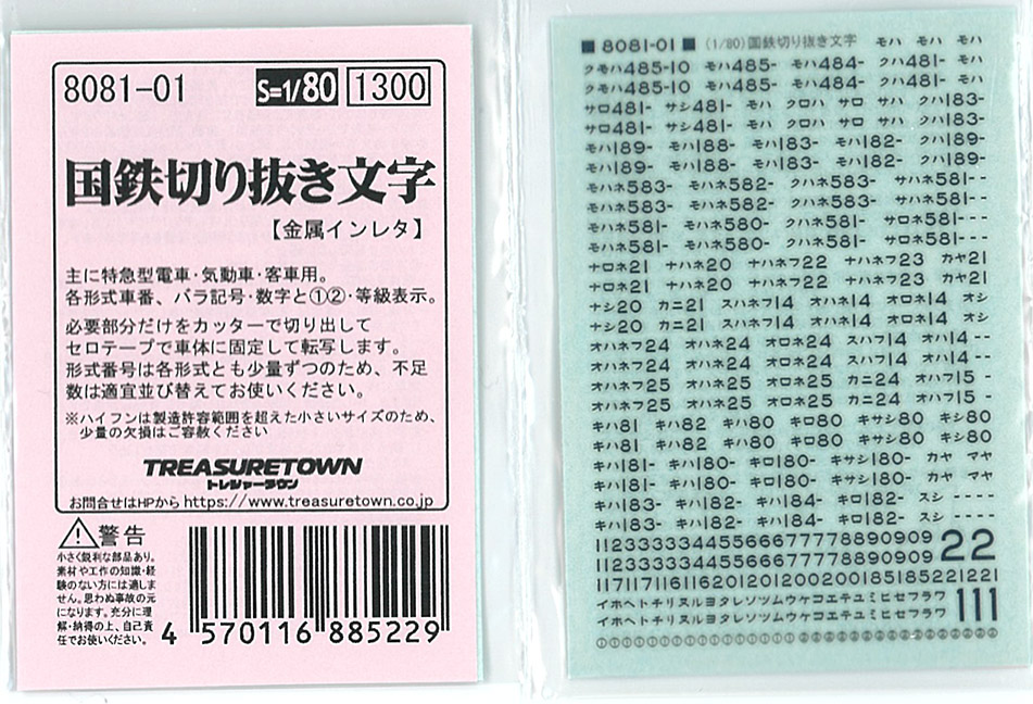 | 8081-01 | 金属インレタ 国鉄切り抜き文字 | I | \1,430 | 特急型EC/DC/PC | |