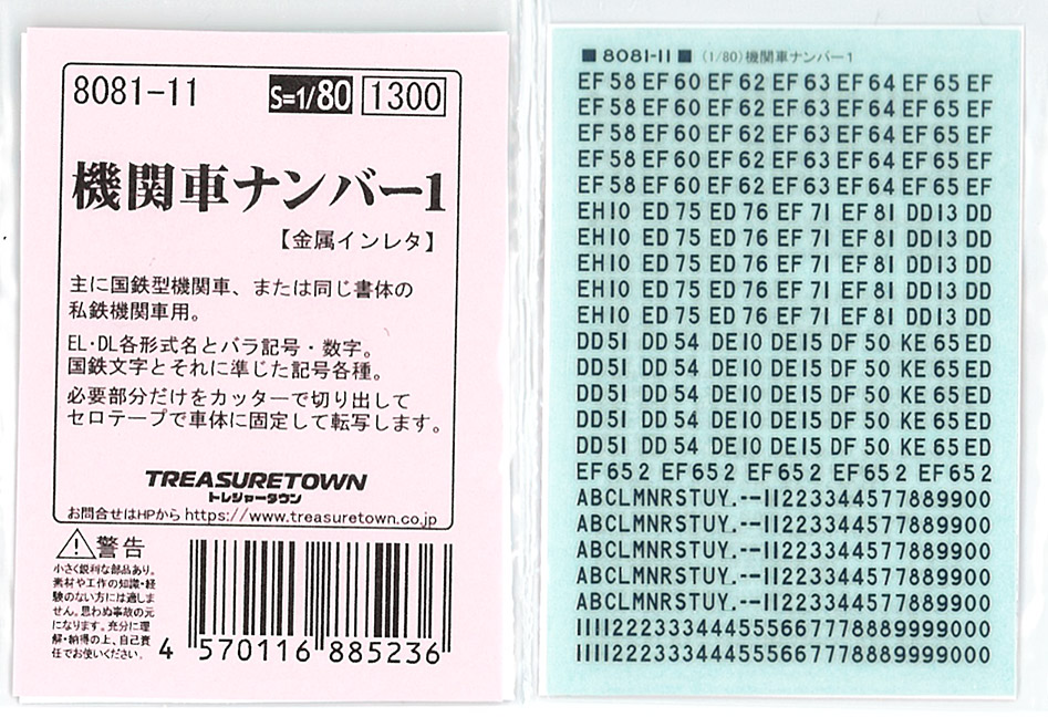 | 8081-11 | 金属インレタ 国鉄機関車ナンバー 1 | I | \1,430 | EL/DL記号・数字 | |