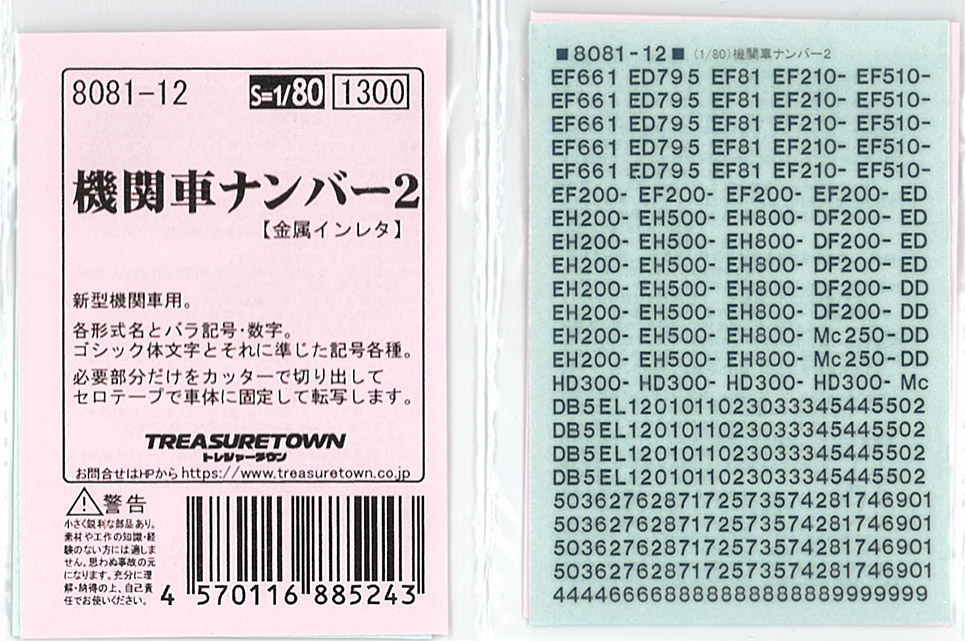 | 8081-12 | 金属インレタ 国鉄機関車ナンバー 2 | I | \1,430 | 新型機関車用 | |
