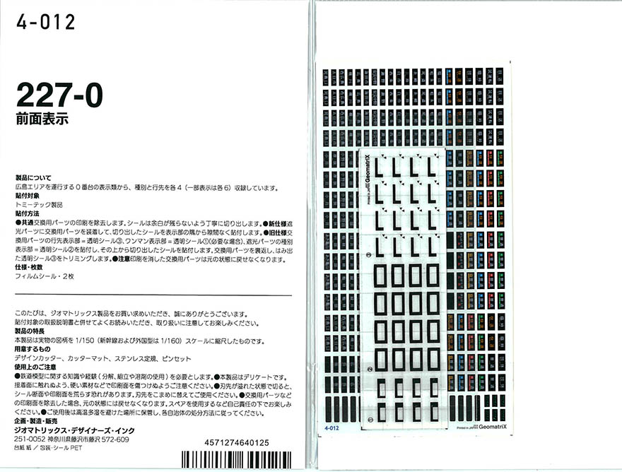 | 4-012 | シール 227系-0 前面表示 (トミーテック製品対応) | 1枚入 | ¥1,320 | ¥1,320 | 新製品 |