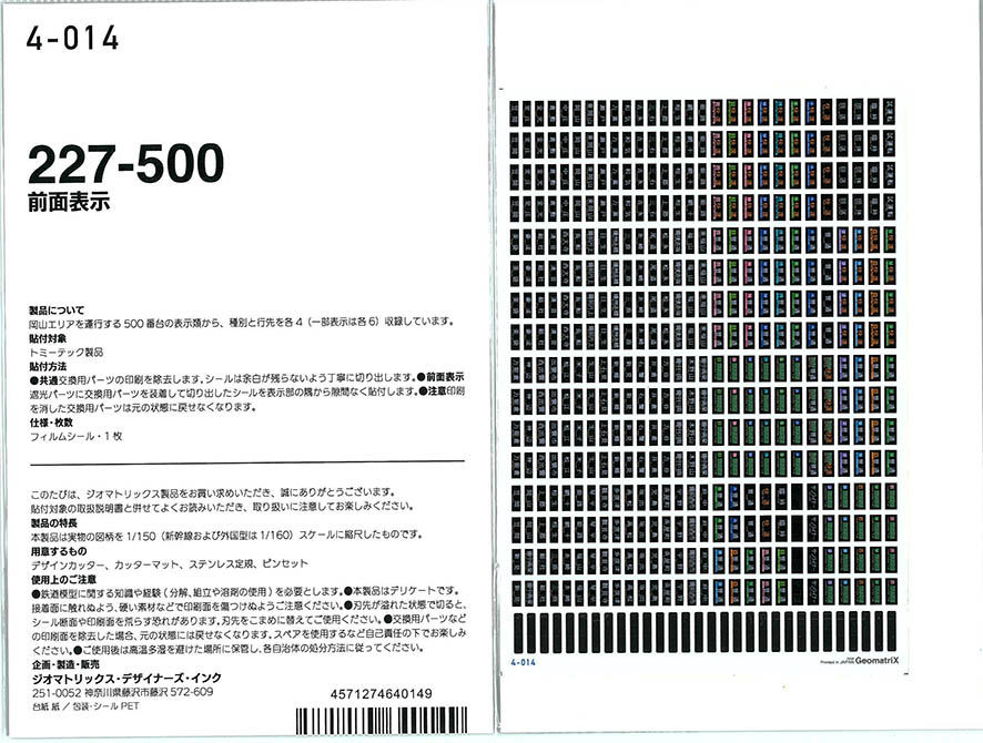 | 4-014 | シール 227系-500 前面表示 (トミーテック製品対応) | 1枚入 | ¥990 | ¥990 | 新製品 |