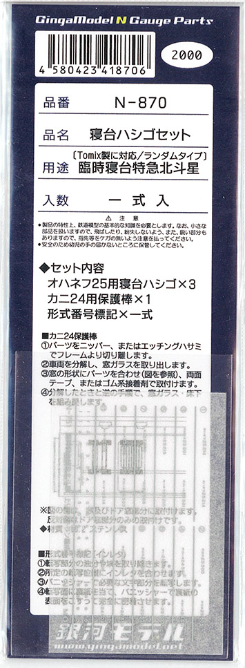 | N-869 | 寝台ハシゴ・インレタセット (TOMIX・全開/臨時寝台特急北斗星用用) | 3両 | ¥2,200 | 完売 | |