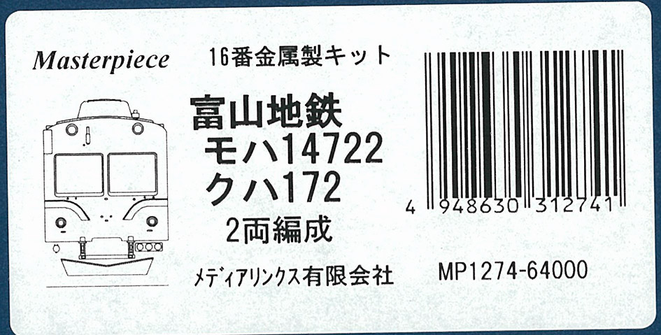 | MP1274 | 富山地鉄モハ14722+クハ172 | ボディーキット | 2両 | \70,400 | \66,880 | 新製品5%OFF |